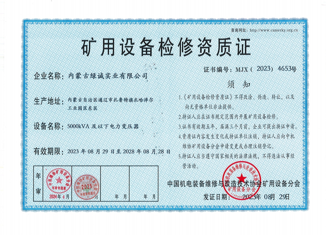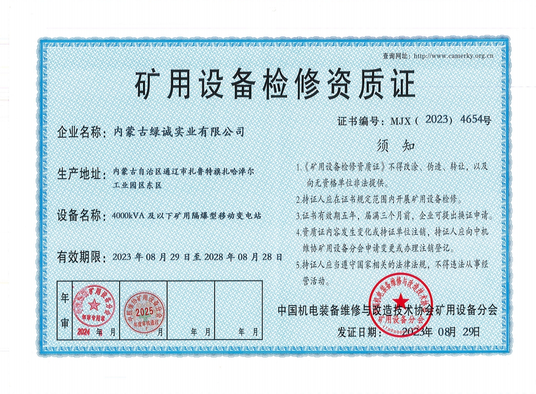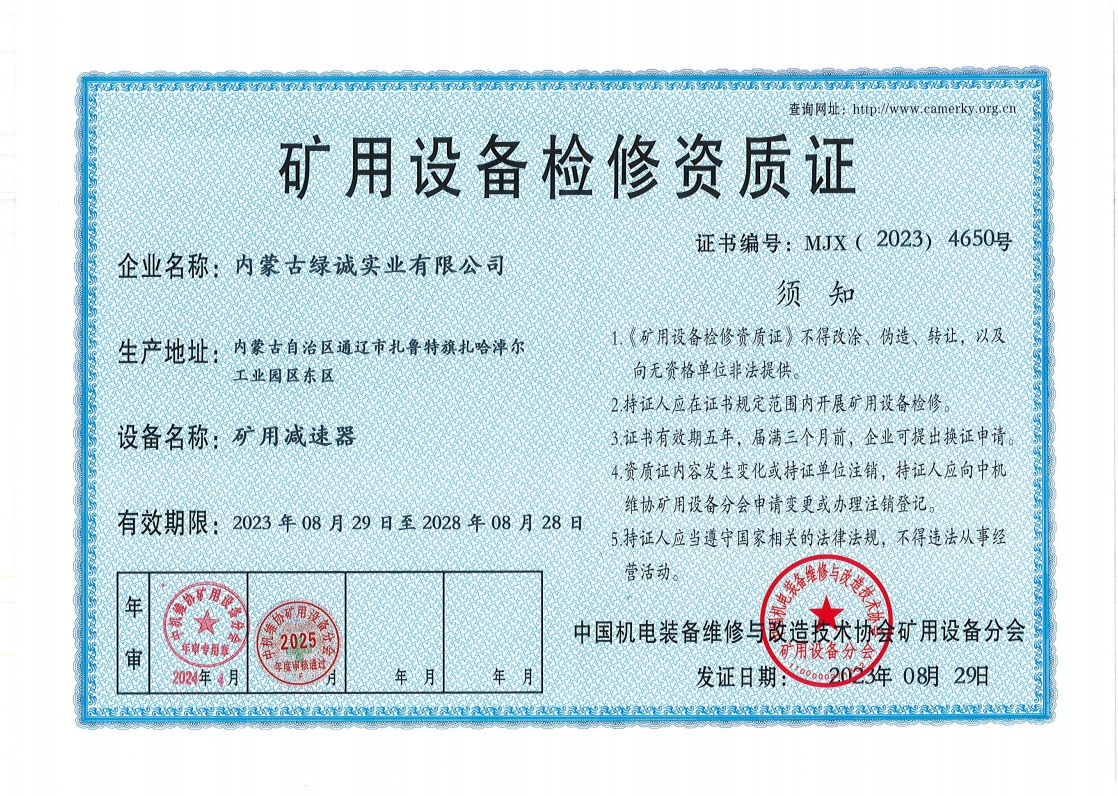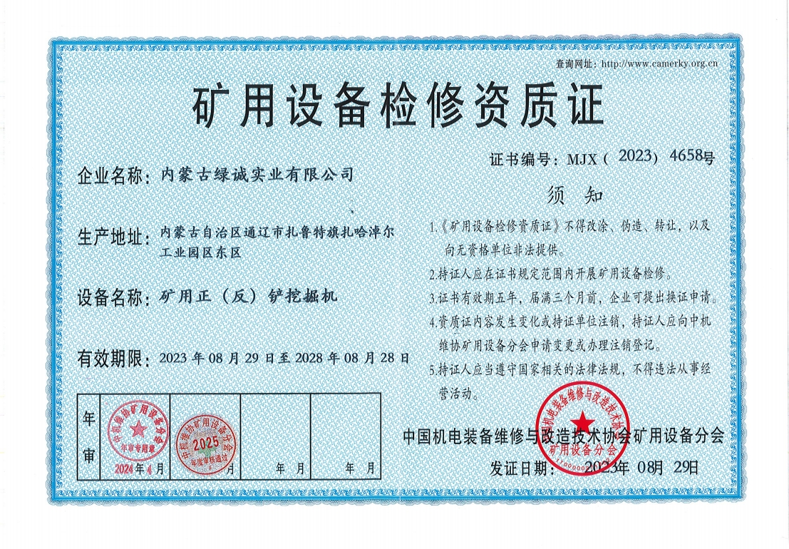 2018年我公司通過中國機電裝備維修與改造技術(shù)協(xié)會礦用設備分會審核并取得了9項礦用設備檢修資質(zhì)證書。公司本著“誠信為本 質(zhì)量為先 全心全意為客戶 ”的服務理念,圓滿完成各個廠礦的機械維修及配套服務,期待與您共同合作。